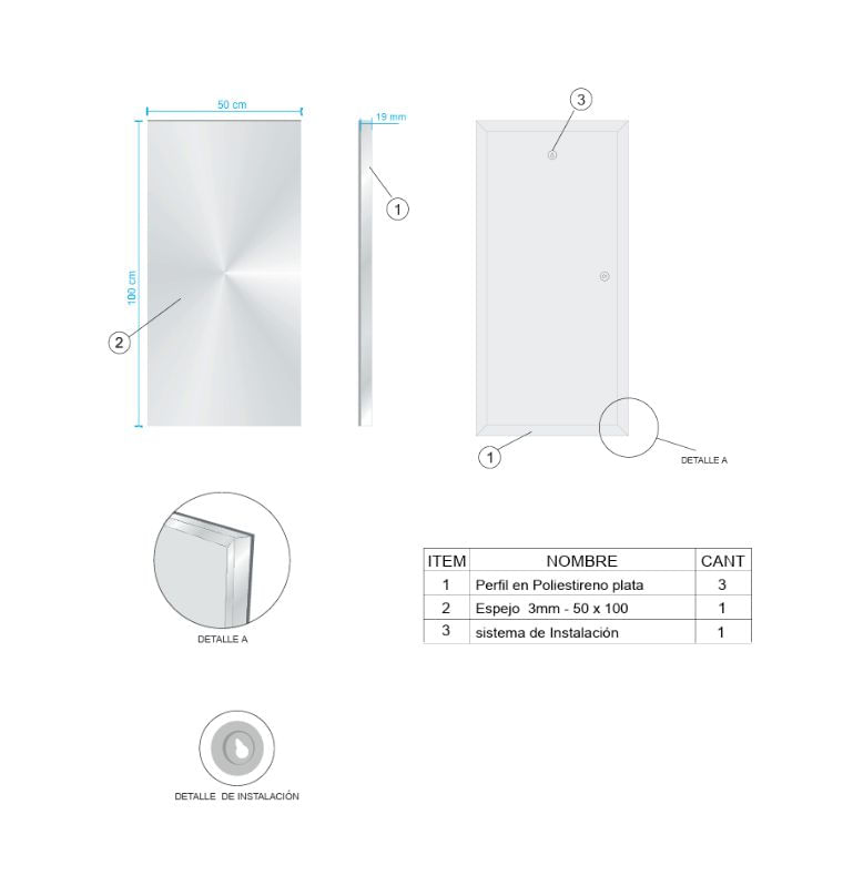 ESPEJO 50X100CM KALAHARI S/LED PLATA